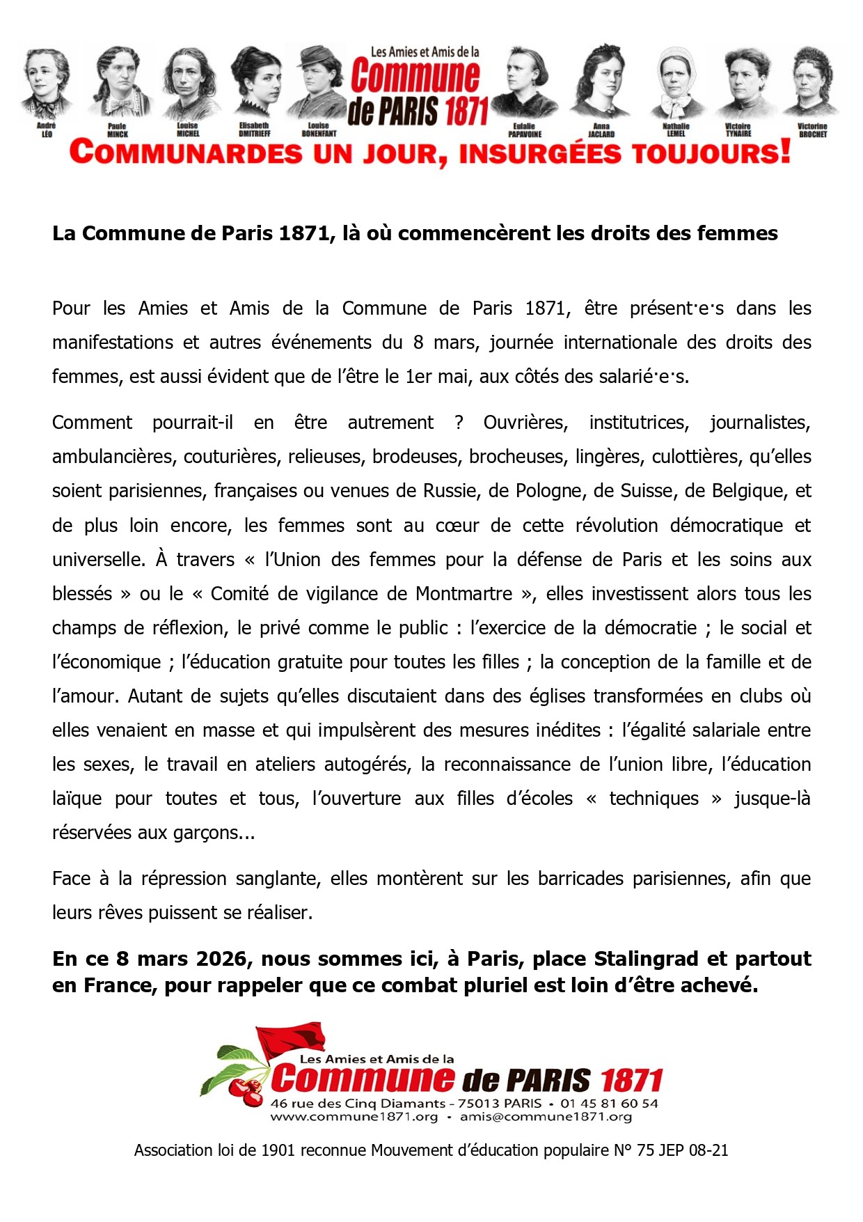 Les Amis et Amis de La Commune de Paris 1871 participeront à la manifestation qui partira à 14h de la Place Stalingrad, Paris 19e.