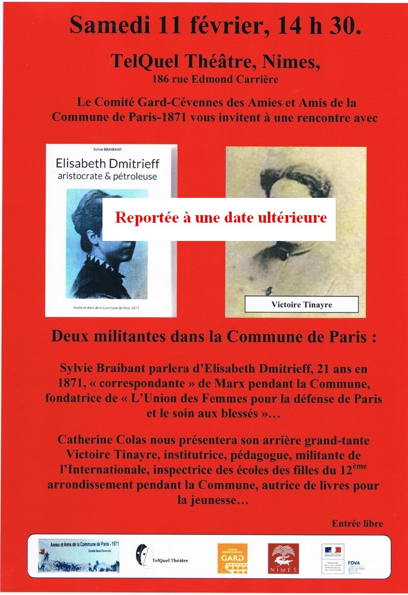 Sylvie Braibant, co-présidente nationale des Amies et Amis de la Commune de Paris 1871 nous parlera d’Elisabeth Dmitrieff et Catherine Colas de son arrière grand-tante Victoire Tinayre.