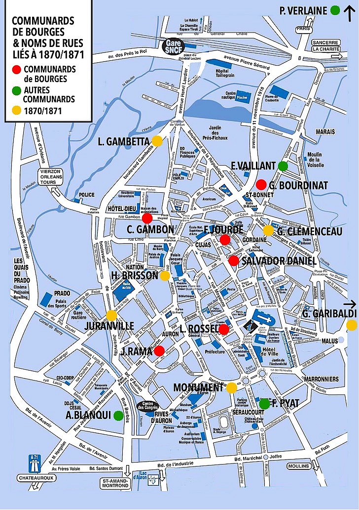 seul le rassemblement Vaillant à Vierzon a pu avoir lieu le 29 janvier. Les manifestations en mars (sauf le théâtre scolaire) sont annulées ou reportées, comme deux rencontres au bar L’Antidote : Les communeux qui inspirent les théâtreux, Les provinces et la Commune. Notre comité élargit à d’autres collectifs. Ainsi, l’IHS-CGT a prévu une exposition, des conférences à Vierzon et à Bourges. À la Maison des syndicats, à Bourges, il nous associe aux mercredis de la CGT, du 7 avril au 6 juin : Des faits, des décrets, des symboles ; Relire Lissagaray ; Les femmes ; La Commune face à ses ennemis ; Vive la Sociale ; La Commune et l’international ; Actualité de la Commune ; Comment on enseigne la Commune ; Le cinéma et la Commune ; Vaillant, tête pensante de la Commune. Une programmation s’organise à Vierzon autour du centre multimédia. J.-P. Gilbert (blog : gilblog , ouvert sur la Commune), auteur des Communards du Cher, pratique « la Commune à domicile ». Des parcours sont prévus à Bourges et à Vierzon. Avec l’association Mille Univers, à la mairie de Bourges, nous ferons une exposition sur Rossel, qui fut ici capitaine de génie (les T-shirts du national y seront). Deux événements à Baugy, où naquit Gabriel Ranvier : 8 juillet (naissance), conférence et gerbes ; 25 novembre (décès), gerbes. Le travail multimédia de la plasticienne Christiane Carlut, de notre comité, sera présenté à Vierzon au festival « Belle et rebelle ». Les médias locaux (presse, BIP TV, radios) retracent nos activités : un atout en province. Le Berry Républicain tire à plus de 30 000, et l’hebdo à 12 000. Notre blog Vaillantitude est bien suivi.